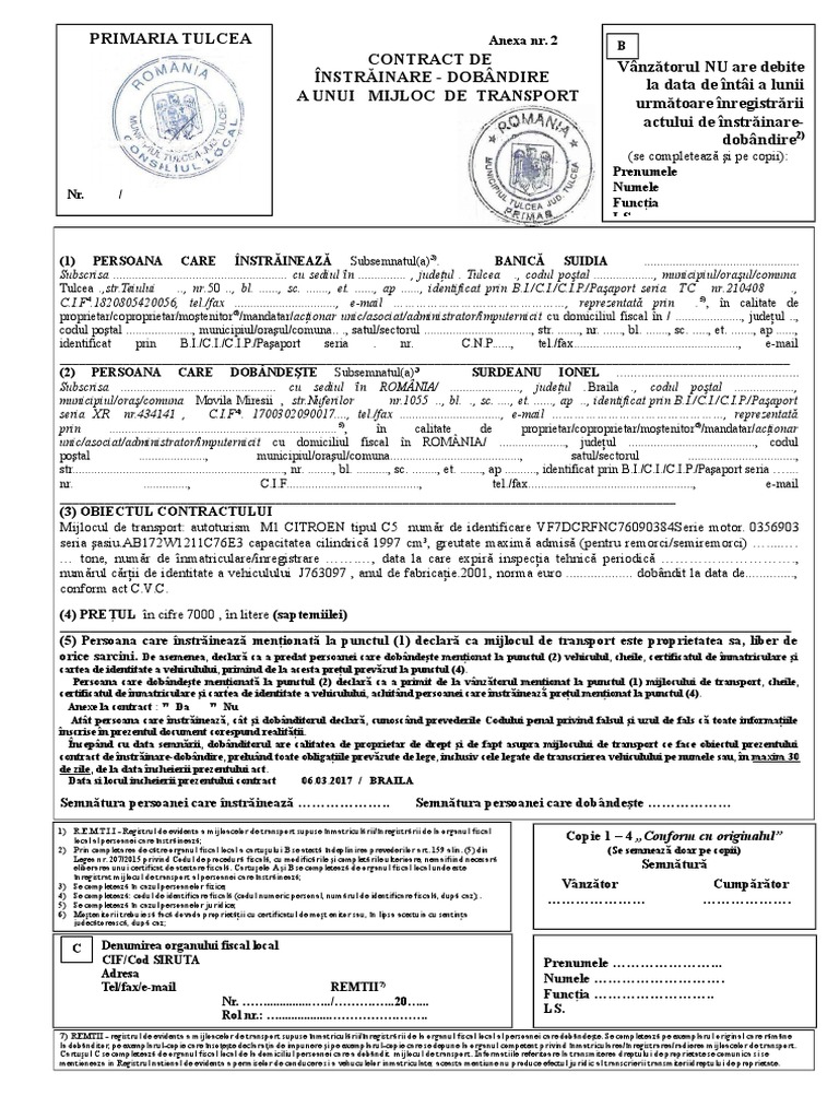 Contract De Instrăinare Dobandire A Unui Mijloc De Transport Primaria Tulcea Vanzătorul Nu Are Debite La Data De Intai A Lunii Următoare Inregistrării Actului De Instrăinare Dobandire