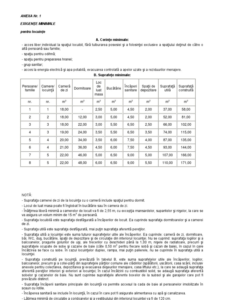 Anexa 1 Legea Locuintei Suprafete Minime
